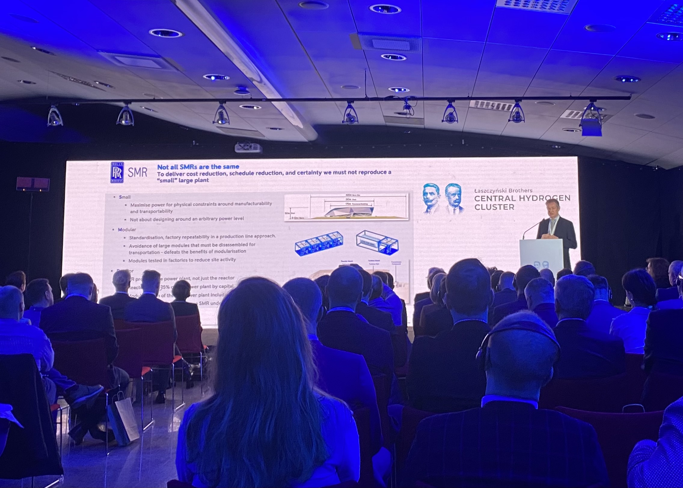 W czasie Targów wzięliśmy udział w spotkaniu sygnatariuszy Centralnego Klastra Wodorowego im. Braci Łaszczyńskich. Przekazywane informacje były dla nas nadzwyczaj interesujące. Dowiedzieliśmy się, że lider Centralnego Klastra Wodorowego – Świętokrzyska Grupa Przemysłowa Industria, jest prekursorem w poszukiwaniu technologii prowadzących do zeroemisyjnego wytwarzania energii i produkcji „zielonego wodoru”. Już w lutym Industria podpisała memorandum z brytyjską firmą Rolls-Royce SMR umożliwiające współpracę przy wdrażaniu małych reaktorów modułowych pozwalających zasilać domy, miasta oraz przemysł. I właśnie głównym punktem programu dedykowanemu Centralnemu Klastrowi Wodorowemu było otwarte spotkanie z przedstawicielami firmy Rolls- Royce SMR.